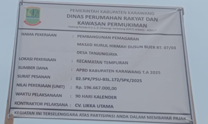 JIB | Karawang — Pembangunan pemagaran Masjid Nurul Hikmah yang berlokasi di Dusun Buer RT 07/03, Desa Tanjungjaya, Kecamatan Tempuran, Kabupaten Karawang, disorot publik. Proyek yang dibiayai APBD Kabupaten Karawang Tahun Anggaran 2025 senilai Rp196.667.000 dan dikerjakan oleh CV. Likka Utama itu diduga kuat tidak sesuai spesifikasi teknis (spek).
